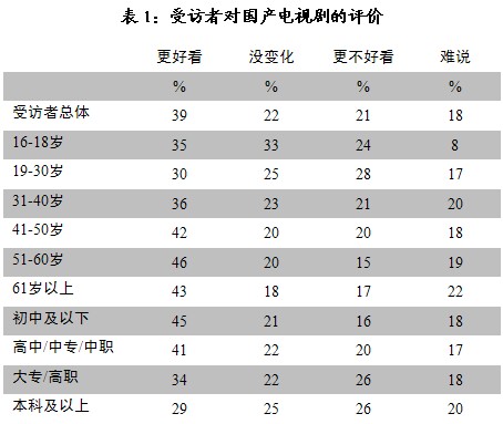 对近年国产电视剧,认为“更好看”的受访者比例为39%;而认为没进步的人较多,为43%,其中“没变化”和“更不好看”的比例分别为22%与21%。