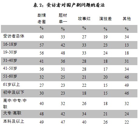 分析来看,80、90后和高学历者认为“剧情老套”和“题材单一”的人更多,比例基本接近或超过50%(见表2)。即使是认为国产剧“更好看”的受访者,持以上看法的人也在三成左右。