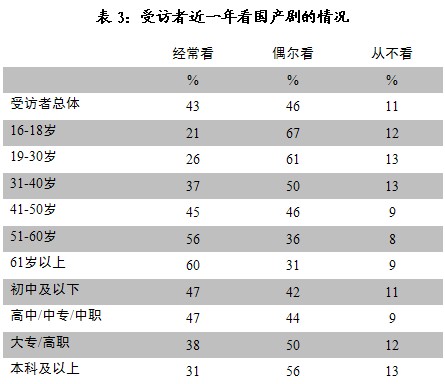 对于“近一年有没有观看国产电视剧”,46%的受访者表示“偶尔看”,11%的人表示“从不看”,不常看的人合计达57%,多于表示“经常看”的43%。