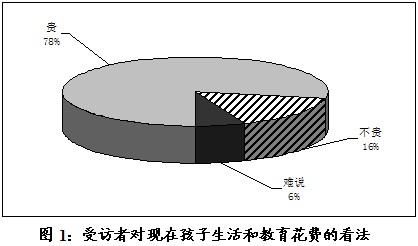 对现在孩子的生活和教育花费,认为“贵”的受访者比例达78%,认为“不贵”的只有16%(见图1)。