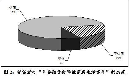 对“多养孩子会降低家庭生活水平”这一说法,大多数受访者表示“认同”,比例达71%,而“不认同”的比例为22%(见图2)。
