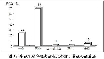 对现在年轻夫妇生几个孩子最适合,多达69%的受访者认为生两个,而认为生一个的比例也不少,为24%(见图3)。
