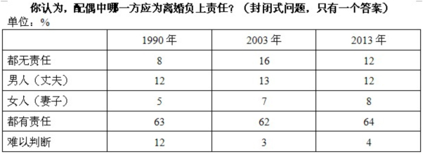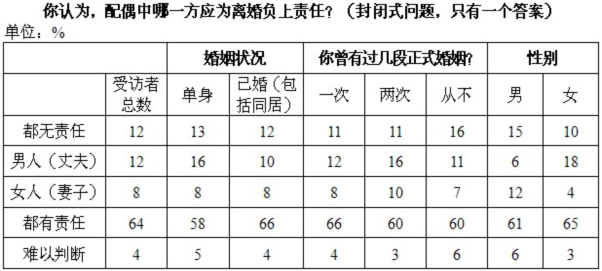 近几十年来,俄罗斯人对离婚的看法并无发生改变。大部分俄罗斯人(64%)一如既往地认为男人和女人都应该为家庭破裂负上责任。持这种看法的多为女性(65%),已婚或同居人士(66%)以及只结过一次婚的人士(66%)。剩下的人认为男人应该比女人负上更大责任(两者比例分别为12%和8%)。认为女人该负上主要责任的男人比例为12%。与此相反,女人倾向于认为男人该负上责任(18%)。其余12%的人认为原因在于境遇,双方都无责任。