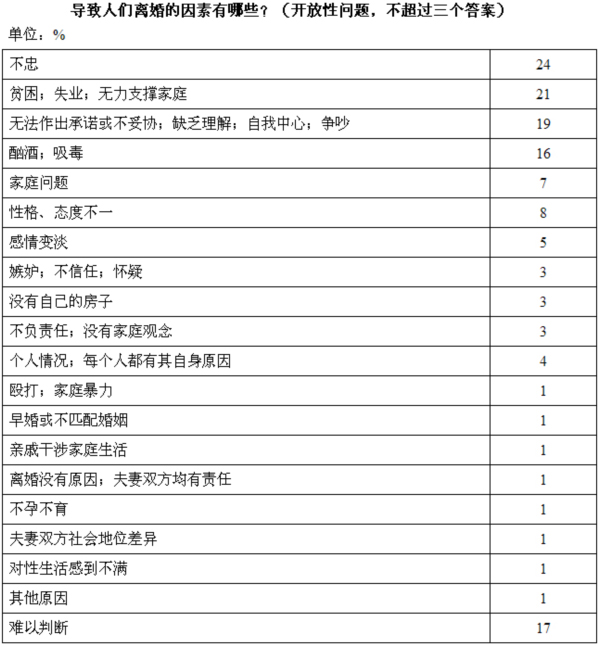 受访者认为,不忠(24%)和贫困(21%)导致人们离婚。他们认为其他导致离婚的原因还包括无法作出承诺、争吵(19%)以及如酗酒和吸毒(16%)等恶习。极少有受访者认为性格、态度不一(8%)、家庭问题(7%)以及感情变淡(5%)是离婚的原因。有部分受访者指出,嫉妒、不负责任和没房子(各比例均为3%)也是导致离婚的原因。其他原因并非普遍看法(只占1%)。接受调查的4%俄罗斯人认为每一离婚个案都有其各自的原因和情况。