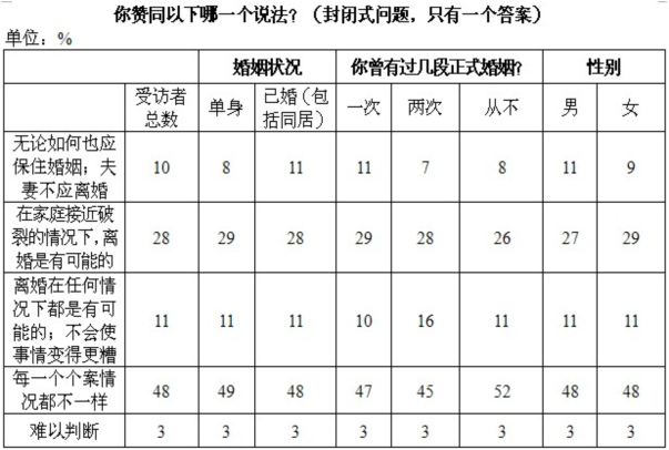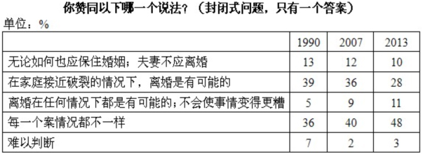 受访者被问及是否能接受离婚时,约半数人认为这要看具体情况(1990年:36%,2013:48%)。持此种立场的人多为没有正式结婚的人。每十人中便有一人认为离婚在任何情况下都是可以接受的,并且离婚并不会使事情更糟。(2013:11%,1990年只有5%)。有此看法的人基本上是正式结婚两次或以上的人士(16%)。同样比例的受访者持相反意见,他们认为绝不应该离婚,而且应以一切方式保护婚姻(10%)。与1990年相比,更少人认为,如果家庭已接近破裂,离婚是可以接受的。(1990:39%,2013:28%)