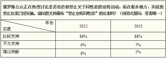 绝大多数的俄罗斯群众都支持颁布“禁止宣传同性恋”法案。支持人数在2012年为86%,到了今年上升至88%。反对这个法案的俄罗斯人仅有7%。