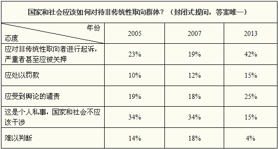 俄罗斯公众中有相对较多的人(42%)也表示,非传统性取向者应该被起诉。持相同意见的人在2007年的时候仅有19%。有四分之一的受访者(25%)相信,非传统性取向者应该受到舆论的谴责(2007年为18%)。而认为应该对非传统性取向者进行罚款处理的人数有了小幅度增加(原来为12%,现在为15%)。相反的,认为国家和社会不应该干涉他们的人数则有了一定的下降(2007年为34%,现在仅为15%)。