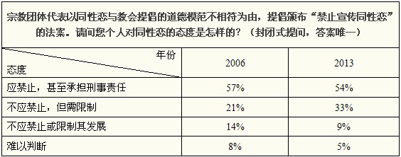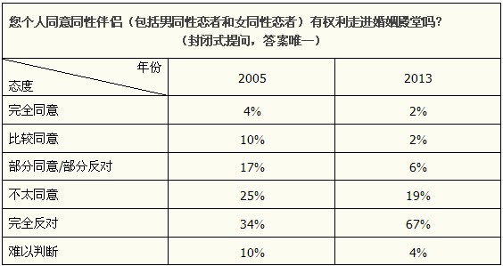 近年来反对同性婚姻的人数有一定上升,从2005年的59%上升到现在的86%。同时,认为同性伴侣有权利走进婚姻殿堂的人数有了急剧下降,由原来的14%下降到4%。而对此观点持部分肯定或部分否定态度的人同样减少了,由原来的17%下降到6%。