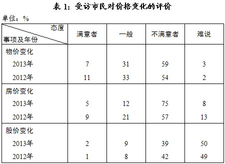 与2012年相比,对房价变化不满者大幅增加18个百分点,对物价变化不满者也增加5个百分点(见表1)。