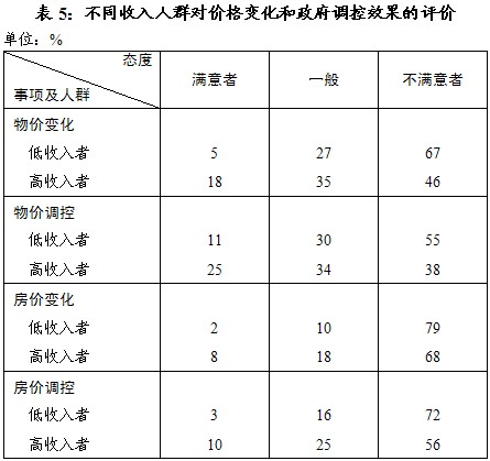 对房价变化和房价调控效果,低收入者不满更甚,不满者达79%和72%(见表5),且较去年增加15个百分点及以上。