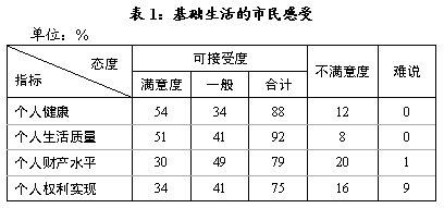 “个人健康”、“个人生活质量”、“个人财产水平”、“个人权利实现”是个人生活基础性的事项,决定和影响着个人生活的总体状况。调查表明,市民“个人健康”感受的满意度最高,达到54%;“个人财产水平”感受的满意度最低,仅30%;需要指出的是,市民“个人权利实现”感受的满意水平也相对较低(见表1)。