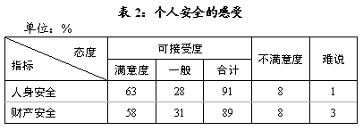受访者个人安全感受的评价明显要好,调查设定的两项指标的满意度均在六成左右(见表2)。