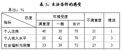 调查设定的三项指标总体满意水平相对偏低,不满水平在本项调查中居高。其中“个人收入”感受的满意度与不满意度接近,显示了民众感受的分化(见表3)。