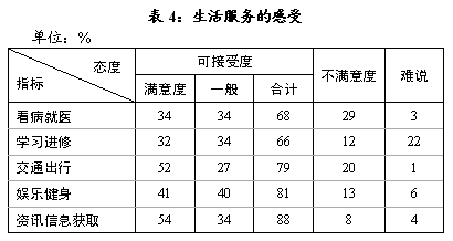 市民对生活服务的感受呈现明显的差异:一是服务类型的感受评价不一,市民对“资讯信息获取”和“交通出行”满意感受均过五成,而“学习进修”、“看病就医”感受的满意水平仅三成余;二是市民感受相对分化,“看病就医”感受的不满意度达到29%,是本项民调中最高的,“交通出行”感受的不满意度也达到两成(见表4)。