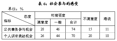 本项民调着重了解市民对社会参与“机会”的感受。调查显示,市民的感受明显最差,两项指标的满意度均未超过30%,且“个人诉求表达机会”感受的满意度为23个指标中最低的。此外,表示“难说”的受访者比例也均高(见表6)。