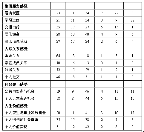 市民对人生价值的感受相对显弱,其中对“个人得到的社会尊重”的感受最好,满意度达到五成;而对“个人谋生和事业发展机会”的感受较差,满意度仅三成(见表7)。