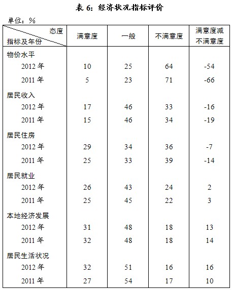 经济状况方面,半数指标评价不满者多于满意者。与上年相比,对“物价水平”、“居民住房”的不满有所下降,持不满评价者分别减少7个、3个百分点,反映近年政府宏观调控的效果。但需指出的是,两项的不满者比例依旧突出,“物价水平”仍达64%的甚高水平(见表6)。