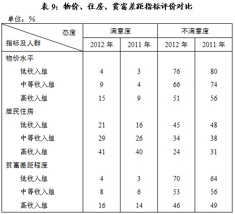 对“物价水平”、“居民住房”,低收入组不满仍明显高出。尤其是“居民住房”,高、低收入组评价差异显著,低收入组不满评价者多达45%,相反高收入组满意者为41%。对“贫富差距程度”,低收入组不满在甚高水平上还持续上升,达70%(见表9)。