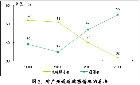 对广州道路塞车情况,认为“经常有”的受访市民连年增多,今年增至55%,较2011年大幅上升20个百分点;认为“高峰期才有”的人从2011年的51%降至32%(见图2)。