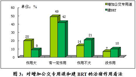 对建BRT的治堵作用,认为“作用大”和“有一定作用”的受访市民,合计为51%,与肯定增加公交专用道作用的人相比,少了18个百分点;而认为“作用不大”和“没作用”的人较多,为31%(见图3)。