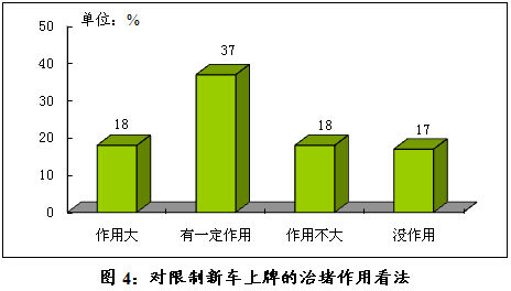 对限制新车上牌的治堵作用,认为“作用大”和“有一定作用”的市民为55%,而认为“作用不大”和“没作用”的人,在三项治堵措施中最多,为35%(见图4)。