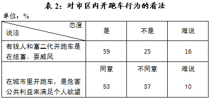 对于市区内开跑车的行为,市民观感趋于负面。59%的人认为是有钱人和富二代在炫富、耍威风。更为甚者,53%的市民认为是危害公共利益来满足个人欲望(见表2)。