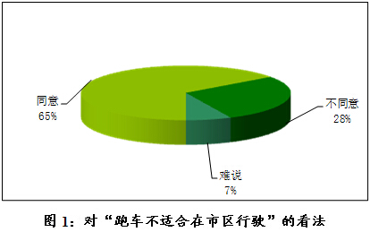 对“跑车不适合在市区行驶”这一说法,多数市民表示“同意”,比例达65%,“不同意”的人不到三成(见图1)。