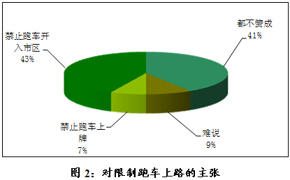 民调显示,市民主张“禁止跑车开入市区”的人有43%,还有7%的人主张“禁止跑车上牌”,两者合计达50%(见图2)。看来,市区禁行跑车,已具备群众基础。