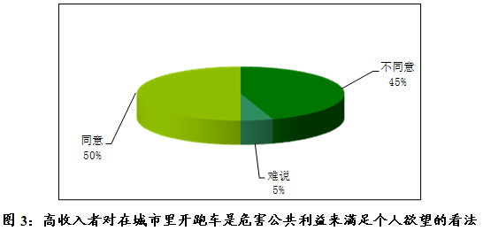 分析显示,“开跑车是在炫富、耍威风”是高收入者的主流看法,比例有53%,且多数高收入者对“开跑车是危害公共利益来满足个人欲望”的看法表示“同意”,比例达50%(见图3)。调查亦显示,有44%的高收入者支持“禁止跑车开入市区”或“禁止跑车上牌”。