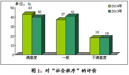 五个具体评价事项中,“社会秩序”评价最好,表示“满意”和“比较满意”的受访市民合计为43%,且较2013年上升3个百分点;表示“不太满意”和“不满意”的人不到两成,为18%(见图1)。