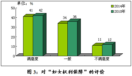 对“妇女权利保障”,受访市民维持较好评价,满意度与2010年基本持平,为41%,不满意度仅为11%(见图3)。