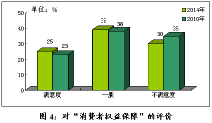 对“消费者权益保障”,受访市民评价略有上升,不满意度较2010年下降了5个百分点,为30%,但仍高于25%的满意度(见图4)。
