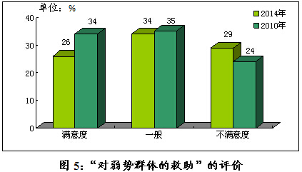 “对弱势群体的救助”,受访市民评价转差,满意度较2010年下降了8个百分点,至26%;不满意度则升至29%,超过了满意度(见图5)。