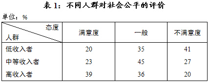 分析发现,低收入者对“社会公平”不满突出,不满意度达41%,满意度则为20%;相反,高收入者满意度高至39%(见表1)。