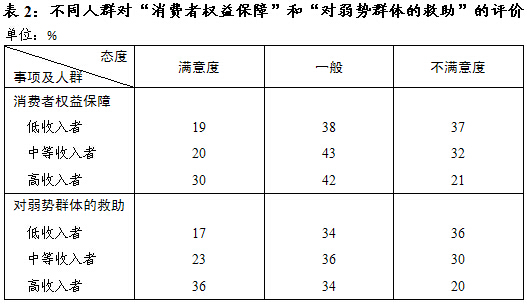 分析还发现,低收入者对“消费者权益保障”和“对弱势群体的救助”的满意度均不足两成,而不满意度分别为37%和36%,均明显高出高收入者16个百分点(见表2)。