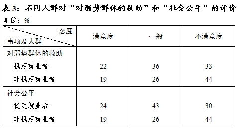 此外,失业、打散工、临时工的非稳定就业者,对“社会公平”和“对弱势群体的救助”不满也突出,不满意度均达44%,高出稳定就业者10个百分点以上(见表3)。