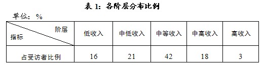为了便于研究及减少统计误差,本研究将10个分值按2分一组进行合并,得出受访者5组收入分层,分层人群占总受访人群的比例(见表1)。