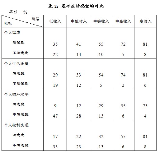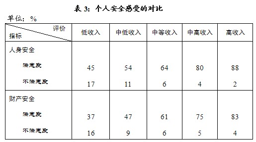二、在个人安全感受方面,低收入阶层评价不低;其他阶层的满意感受更显著好,中等收入阶层的满意度已超过六成(见表3)。