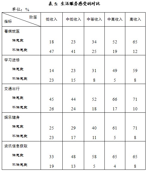 四、生活服务感受方面,阶层差异相对较小。其中“交通出行”和“资讯信息获取”的差距小,“看病就医”的差距大。需要指出的是,低收入阶层不仅“看病就医”的满意度低,且“学习进修”的满意度更低,仅14%,这显然不利于该阶层人员改变自身处境;此外,各阶层对“学习进修”的满意水平也均低。有意思的是,在“交通出行”方面,低收入者的满意水平高,与其他阶层差距最小,看来,更多的自行车和步行出行,使低收入者免除了不少交通拥堵、公交拥挤的烦恼(见表5)。