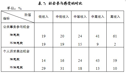 六、社会参与感受各阶层的满意水平均低。高收入阶层的满意度在60%左右;而低收入及中低收入阶层的满意度均不超过20%,中等收入阶层的满意度仅24%,亦明显偏低(见表7)。
