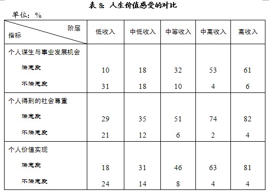 七、人生价值的感受,不同阶层间的差异,也最为显著。三项指标高、低收入阶层的满意水平,相差在50个百分点以上。低收入阶层对“个人谋生与事业发展机会”和“个人价值实现”,均为负面的评价。数据显示,各阶层对个人“发展机会”的感受均要较差,低收入阶层尤甚。除此之外,中等收入以上的阶层,均有良好的人生价值感受(见表8)。