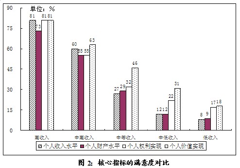 以上是各阶层在生活感受七个方面的对比。在本调查23项指标中,“个人收入水平”、“个人财产水平”、“个人权利实现”和“个人价值实现”是个人生活的核心事项指标,恰恰就在这些方面,不同阶层的满意水平落差最大,高低两极差距超过了60个百分点。“个人收入水平”高收入阶层81%的满意度与低收入阶层8%的满意度,构成了鲜明的对比(见图2)。