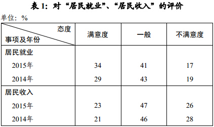 对“居民就业”,市民满意度为34%,较去年升了5个百分点;表示“不满意”和“不太满意”的市民合计比例为17%。