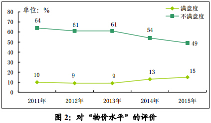 对“物价水平”,不满意度自2011年以来首次降至五成以下,但仍高达49%,而满意度仅15%(见图2)。