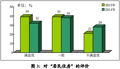 对“居民住房”,市民满意度较去年升了7个百分点,为39%;不满意度降至21%(见图3)。