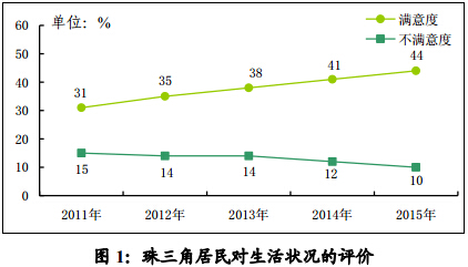 总的来看,珠三角居民对生活状况多感满意,2015年表示“满意”与“比较满意”的受访者比例合计为44%,而表示“不满意”与“不太满意”的仅10%。