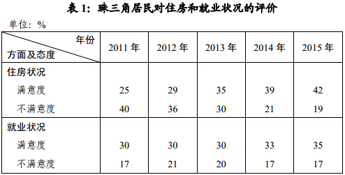 民调显示,珠三角居民对住房状况的满意度,自2011年以来持续上升17个百分点至42%,明显超过不满意度,与前几年的负面评价截然相反;对于就业状况,近年珠三角居民的满意度升至35%,三人中就有一人满意(见表1)。
