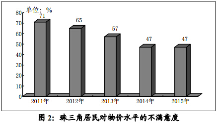 近几年物价上涨幅度放缓,珠三角居民的不满水平下降显著,不满意度从71%的甚高水平降至47%,大幅下降了近25个百分点(见图2)。显然,以“控物价”来“惠民生”,让珠三角居民在生活上切实感受到了实惠。