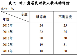 对于收入状况,珠三角居民的满意度虽有上升,但仍不足25%(见表2),与欠发达的粤东西北居民评价一样低。看来,虽然珠三角居民生活成本有所下降,但收入增长缓慢,生活压力依然很大。
