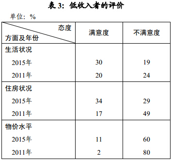 具体来看,住房状况和物价水平是低收入者评价改善最大的方面,其中住房状况的满意度升至不满意度之上,为34%;物价水平的不满意度大幅下降了20个百分点(见表3)。